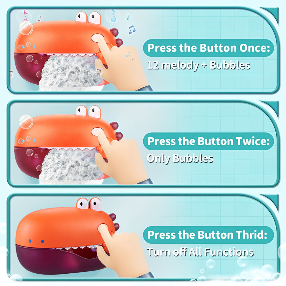 2 play modes: Choose between relaxing music and bubbles mode or an energetic bubbles only mode, offering versatile and engaging bath time entertainment for kids.